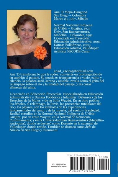 POEMAS del MANANTIAL: Versos de Ana`D Mejía-Dangond, donde transforma lo que le rodea, convierte en prolongación de su espíritu el paisaje. Su poesía es transparencia y vacío, canto y silencio, la palabra sutil, serena y amable, revela como el grito del relámpago sobre el río y la unidad del paisaje, y las cosas efímeras del alma.