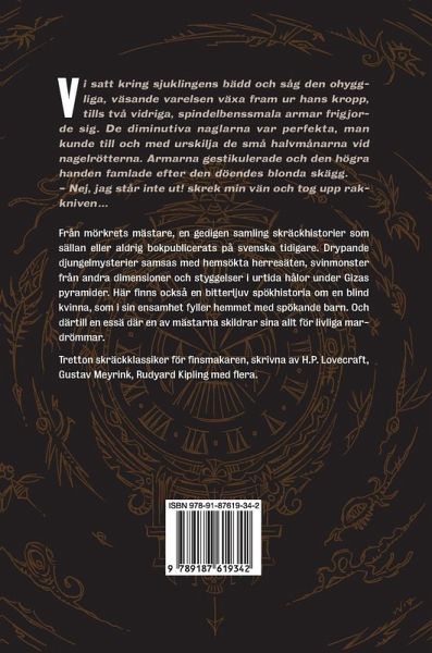 Vi satt kring sjuklingens bädd och såg den ohyggliga, väsande varelsen växa fram ur hans kropp, tills två vidriga, spindelbenssmala armar frigjorde sig. De diminutiva naglarna var perfekta, man kunde till och med urskilja de små halvmånarna vid nagelrötterna. Armarna gestikulerade och den högra handen famlade efter den döendes blonda skägg. -- Nej, jag står inte ut! skrek min vän och tog upp rakkniven... Från mörkrets mästare, en gedigen samling skräckhistorier som sällan eller aldrig bokpublicerats på svenska tidigare. Drypande djungelmysterier samsas med hemsökta herresäten, svinmonster från andra dimensioner och styggelser i urtida hålor under Gizas pyramider. Här finns också en bitterljuv spökhistoria om en blind kvinna, som i sin ensamhet fyller hemmet med spökande barn. Och därtill en essä där en av mästarna skildrar sina allt för livliga mardrömmar. Tretton skräckklassiker för finsmakaren, skrivna av H.P. Lovecraft, Gustav Meyrink, Rudyard Kipling med flera.