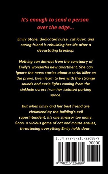 Emily Stone, dedicated nurse, cat lover, and caring friend is rebuilding her life after a devastating breakup. Nothing can detract from the sanctuary of Emily's wonderful new apartment. She can ignore the news stories about a serial killer on the prowl. Even learn to live with the strange sounds and eerie lights coming from the sinkhole across from her isolated parking space. But when Emily and her best friend are victimized by the building's evil superintendent, it's one stressor too many. Soon, a vicious game of cat and mouse ensues, threatening everything Emily holds dear. It's enough to send a person over the edge... Print length: 326 pages