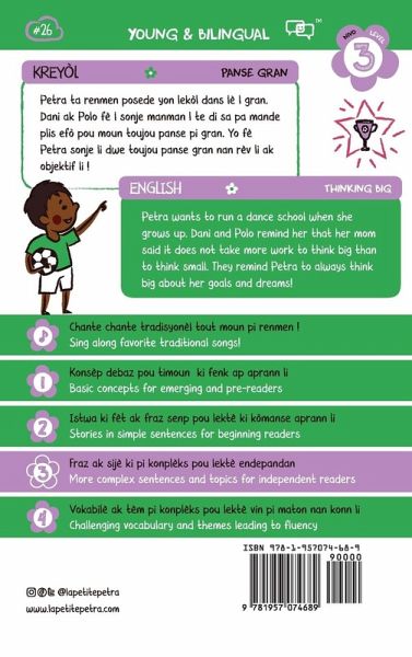 Kreyòl Petra ta renmen posede yon lekòl dans lè l gran. Dani ak Polo fè l sonje manman l te di sa pa mande plis efò pou moun toujou panse pi gran. Yo fè Petra sonje li dwe toujou panse gran nan rèv li ak objektif li ! English Petra wants to run a dance school when she grows up. Dani and Polo remind her that her Mom said it does not take more work to think big than to think small. They remind Petra to always think big about her goals and dreams!
