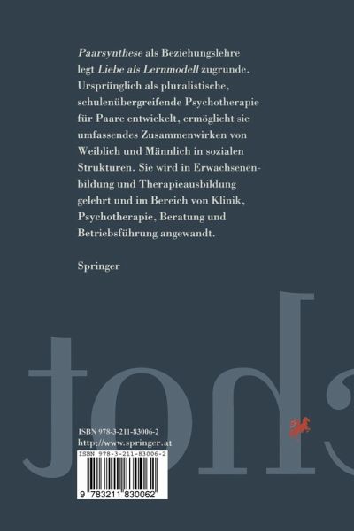 Vorbemerkungen.- 1. Kapitel. Zur Theorie der Liebe.- 1. Suche nach Liebe in den Wissenschaften.- 2. Phänomenologie als Erkenntnisweg zur Liebe.- 3. Sozialpsychologischer Ansatz zum Verständnis von Liebe und Intimität.- 4. Tiefenpsychologischer Ansatz zum Verständnis von Liebe und Intimität.- 5. Intersubjektiver Ansatz zum Verständnis von Liebe und Intimität.- 6. Konsequenzen für die Paarsynthese.- 7. Spiritueller Ansatz zum Verständnis von Liebe und Intimität.- 8. Untersuchungen zur Paarsynthese.- 2. Kapitel. Dyadische Anthropologie.- 1. Zentrale Grundannahmen.- 2. Historische Herleitung dyadischer Anthropologie.- 3. Paarsynthese als dyadische Anthropologie.- 4. Ansatz einer Dyadenlehre.- 5. Paarsynthese als Partnerlehre.- 6. Gedanken zu einer Philosophie der Lust.- 7. Dyadische Anthropologie als Grundlage für Beziehungsgestaltung.- 3. Kapitel. Psychologie der Liebe - Psychologie des Paares.- 1. Begriff der Psychologie des Paares.- 2. Modell der Psychologie des Paares.- 3. Liebes- und Konfliktdynamik des Paares.- 4. Kapitel. Therapeutischer Rahmen der Paarsynthese.- 1. Der Gesamtrahmen.- 2. Implikationen zur Paartherapie.- 3. Therapeutisches Beziehungsmodell der Paarsynthese.- 4. Paartherapie im Rahmen der Paarsynthese.- 5. Kapitel. Paarsynthese als therapeutisches Konzept.- 1. Generelle Wirksamkeit von Paartherapie.- 2. Therapeutischer Prozeß der Paarsynthese.- 3. Konfliktdynamik und ihre therapeutische Bearbeitung.- 4. Wirkungsweise der Paarsynthese.- Abbildungen.
