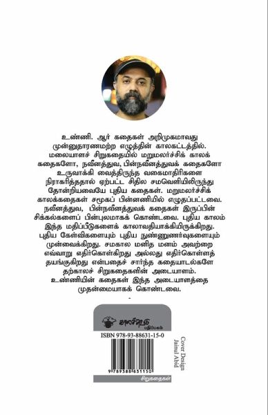 Writer and Screenwriter, Unni R is an unique voice in Malayalam short stories. His style is unprecedented, and rejects the templates established by modern and post-modern short stories in the language. They are also rooted in the existential troubles of the post-modern era. In a time where old values are in shambles, and human morality is struggling with accepting new ones, Unni's short stories portray an identity troubled by the same. These stories are translated into Tamil by Writer, Poet Sukumaran.