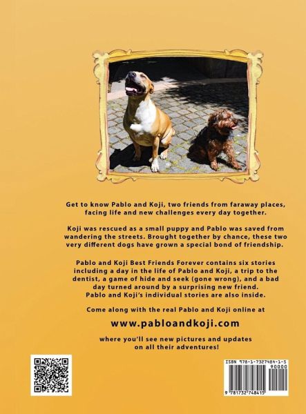 Get to know Pablo and Koji, two friends from faraway places, facing life and new challenges every day together. Koji was rescued as a small puppy and Pablo was saved from wandering the streets. Brought together by chance, these two very different dogs have grown a special bond of friendship. Pablo and Koji Best Friends Forever contains six stories including a day in the life of Pablo and Koji, a trip to the Dentist, a game of hide and seek (gone wrong), and a bad day turned around by a surprising new friend. Pablo and Koji's individual stories are also inside. Come along with the real Pablo and Koji online at www.pabloandkoji.com where you'll see new pictures and updates on all their adventures!