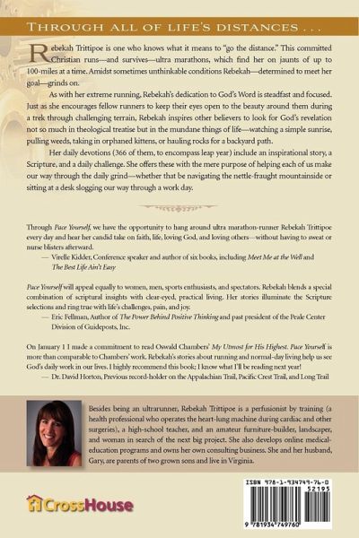 Rebekah Trittipoe is one who knows what it means to "go the distance". This committed Christian runs-and survives-ultra marathons, which find her on jaunts of up to 100-miles at a time. Amidst sometimes unthinkable conditions Rebekah-determined to meet her goal-grinds on. As with her extreme running, Rebekah's dedication to God's Word is steadfast and focused. Just as she encourages fellow runners to keep their eyes open to the beauty around them during a trek through challenging terrain, Rebekah inspires other believers to look for God's revelation not so much in theological treatise but in the mundane things of life-watching a simple sunrise, pulling weeds, taking in orphaned kittens, or hauling rocks for a backyard path. Her daily devotions (366 of them, to encompass leap year) include an inspirational story, a Scripture, and a daily challenge. She offers these with the mere purpose of helping each of us make our way through the daily grind-whether that be navigating the nettle-fraught mountainside or sitting at a desk slogging our way through a work day.
