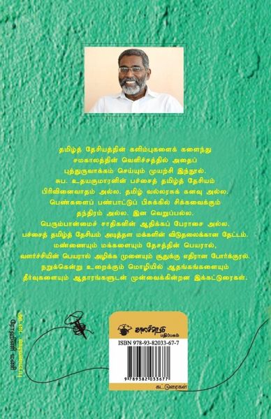This book by S.P. Udhayakumaran is an attempt to recast Tamil Nationalism shed its presets and prejudices and refresh it in new light. Udhayakumaran's Tamil Nationalism is not about dividing, racism, power dreams or caste politics but it's a voice of freedom of the oppressed people. A voice against the treacheries in name of development. These articles explain the problems and suggest solutions.