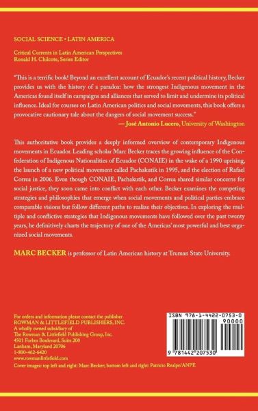 This authoritative book provides a deeply informed overview of contemporary Indigenous movements in Ecuador. Leading scholar Marc Becker traces the growing influence of the Confederation of Indigenous Nationalities of Ecuador (CONAIE) in the wake of a 1990 uprising, the launch of a new political movement called Pachakutik in 1995, and the election of Rafael Correa in 2006. Even though CONAIE, Pachakutik, and Correa shared similar concerns for social justice, they soon came into conflict with each other. Becker examines the competing strategies and philosophies that emerge when social movements and political parties embrace comparable visions but follow different paths to realize their objectives. In exploring the multiple and conflictive strategies that Indigenous movements have followed over the past twenty years, he definitively charts the trajectory of one of the Americas' most powerful and best organized social movements.
