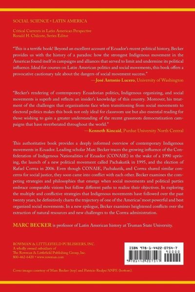 This authoritative book provides a deeply informed overview of contemporary Indigenous movements in Ecuador. Leading scholar Marc Becker traces the growing influence of the Confederation of Indigenous Nationalities of Ecuador (CONAIE) in the wake of a 1990 uprising, the launch of a new political movement called Pachakutik in 1995, and the election of Rafael Correa in 2006. Even though CONAIE, Pachakutik, and Correa shared similar concerns for social justice, they soon came into conflict with each other. Becker examines the competing strategies and philosophies that emerge when social movements and political parties embrace comparable visions but follow different paths to realize their objectives. In exploring the multiple and conflictive strategies that Indigenous movements have followed over the past twenty years, he definitively charts the trajectory of one of the Americas' most powerful and best organized social movements. In a new epilogue, Becker examines heightened conflicts over the extraction of natural resources and new challenges to the Correa administration.