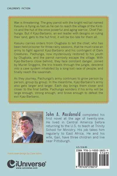 War is threatening. The grey parrot with the bright red tail named Kasuku is flying as fast as he can to reach the village of the Kiritiris and the hut of the once powerful and aging warrior, Chief Pachunga. But if Kjaz-Barbaroi, an evil leader with designs on ruling their land, gets to the hut first, it will be too late for them all. Kasuku carries orders from Olugbala to tell the chief, who has been held prisoner for three rainy seasons, that he must raise an army to fight against Kjaz-Barbaroi and his contingent of Dark Creatures. Pachunga, now mysteriously restored to his youth by Olugbala, and the parrot narrowly escape the village. With Kjaz-Barbaroi close behind, they face constant danger. Joined by Muriel Sniggins, the trio travels through the jungle, descend into a cave system inhabited by a long-lost race of people, and finally reach the savannah. As they journey, Pachunga's army continues to grow person by person, group by group. In the meantime, Kjaz-Barbaroi's army also gets larger and larger. Each day brings them closer and closer to the final battle. Pachunga wonders if his army will be large enough, strong enough, and brave enough to defeat the evil Kjaz-Barbaroi.