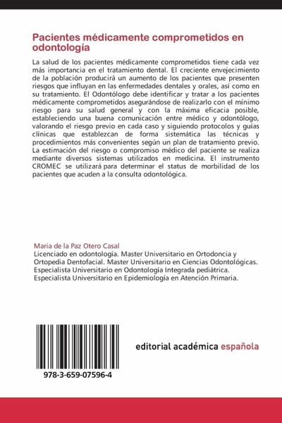 La salud de los pacientes médicamente comprometidos tiene cada vez más importancia en el tratamiento dental. El creciente envejecimiento de la población producirá un aumento de los pacientes que presenten riesgos que influyan en las enfermedades dentales y orales, así como en su tratamiento. El Odontólogo debe identificar y tratar a los pacientes médicamente comprometidos asegurándose de realizarlo con el mínimo riesgo para su salud general y con la máxima eficacia posible, estableciendo una buena comunicación entre médico y odontólogo, valorando el riesgo previo en cada caso y siguiendo protocolos y guías clínicas que establezcan de forma sistemática las técnicas y procedimientos más convenientes según un plan de tratamiento previo. La estimación del riesgo o compromiso médico del paciente se realiza mediante diversos sistemas utilizados en medicina. El instrumento CROMEC se utilizará para determinar el status de morbilidad de los pacientes que acuden a la consulta odontológica.