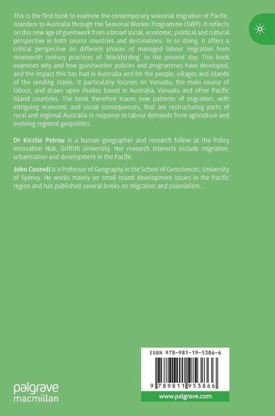 This is the first book to examine the contemporary seasonal migration of Pacific islanders to Australia through the Seasonal Worker Programme (SWP). It reflects on this new age of guestwork from a broad social, economic, political and cultural perspective in both source countries and destinations. In so doing, it offers a critical perspective on different phases of managed labour migration from nineteenth century practices of 'blackbirding' to the present day. This book examines why and how guestworker policies and programmes have developed, and the impact this has had in Australia and for the people, villages and islands of the sending states. It particularly focuses on Vanuatu, the main source of labour, and draws upon studies based in Australia, Vanuatu and other Pacific Island countries. The book therefore traces new patterns of migration, with intriguing economic and social consequences, that are restructuring parts of rural and regional Australia in response to labour demandsfrom agriculture and evolving regional geopolitics.