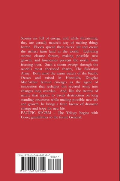Storms are full of energy, and, while threatening, they are actually nature's way of making things better. Floods spread their rivers' silt and create the richest farm land in the world. Lightning storms cleanse forests, making possible new growth, and hurricanes prevent the north from freezing over. Such a storm sweeps through the world's most cherished charity, The Salvation Army. Born amid the warm waters of the Pacific Ocean and raised in Honolulu, Douglas MacArthur Kimuri emerges as the agent of innovation that reshapes this revered Army into changes long overdue. And, like the storms of nature that appear to wreak destruction on long standing structures while making possible new life and growth, he brings a fresh breeze of dramatic change and hope for new life. PACIFIC STORM - The Trilogy begins with Goro, grandfather to the future General.