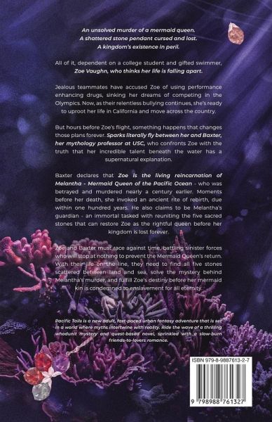 An unsolved murder of a mermaid queen. A shattered stone pendant cursed and lost. A kingdom's existence in peril. All of it, dependent on a college student and gifted swimmer, Zoe Vaughn, who thinks her life is falling apart. Jealous teammates have accused Zoe of using performance enhancing drugs, sinking her dreams of competing in the Olympics. Now, as their relentless bullying continues, she's ready to uproot her life in California and move across the country. But hours before Zoe's flight, something happens that changes those plans forever. Sparks literally fly between her and Baxter, her mythology professor, who confronts Zoe with the truth that her incredible talent beneath the water has a supernatural explanation. Baxter declares that Zoe is the living reincarnation of Melantha - Mermaid Queen of the Pacific Ocean - who was betrayed and murdered nearly a century earlier. He also claims to be Melantha's guardian - an immortal tasked with reuniting five sacred stones that can restore Zoe as the rightful queen before her kingdom is lost forever. But the time to do that is running out, as there are sinister forces who'll stop at nothing to prevent the Mermaid Queen's return. With her life on the line, Zoe must work with Baxter to find all five stones scattered between land and sea and fulfill her destiny - or condemn her mermaid kin to enslavement for all eternity. Pacific Tails is a new adult, fast-paced urban fantasy adventure that is set in a world where myths intertwine with reality. Ride the wave of a thrilling mystery and quest-based novel, filled with mermaids and other unexpected creatures such as immortals, ghosts, demons, and werewolves. Pacific Tails is a slow-burn romance and a fantasical whodunit that will sure to captivate. It is the first book of a planned duology.