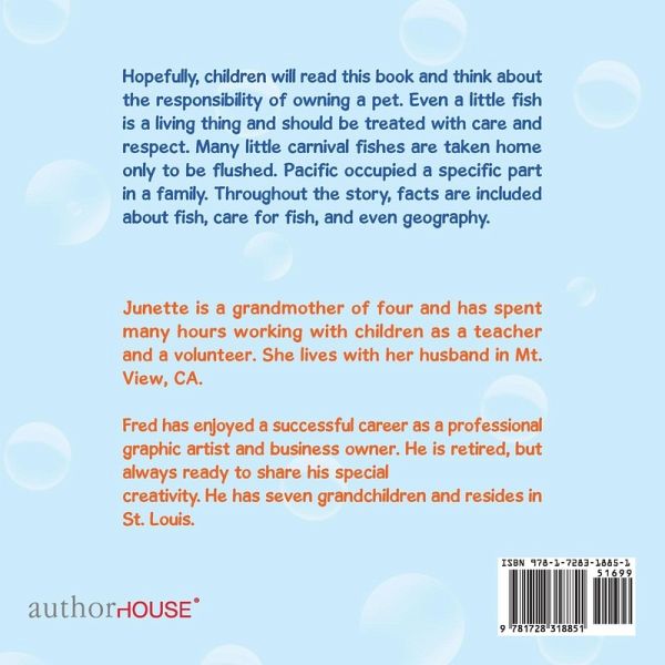 Hopefully, children will read this book and think about the responsibility of owning a pet. Even a little fish is a living thing and should be treated with care and respect. Many little carnival fishes are taken home only to be flushed. Pacific occupied a specific part in a family. Throughout the story, facts are included about fish, care for fish, and even geography.