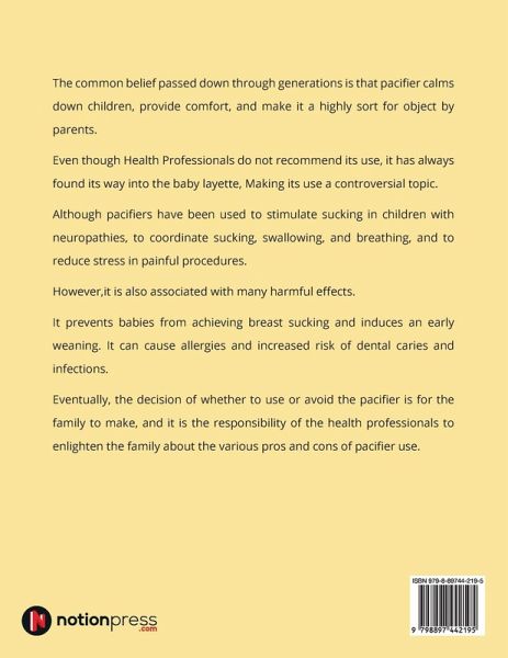 The common belief passed down through generations is that pacifier calms down children, provide comfort, and make it a highly sort for object by parents. Even though Health Professionals do not recommend its use, it has always found its way into the baby layette, Making its use a controversial topic. Although pacifiers have been used to stimulate sucking in children with neuropathies, to coordinate sucking, swallowing, and breathing, and to reduce stress in painful procedures. However, it is also associated with many harmful effects. It prevents babies from achieving breast sucking and induces an early weaning. It can cause allergies and increased risk of dental caries and infections. Eventually, the decision of whether to use or avoid the pacifier is for the family to make, and it is the responsibility of the health professionals to enlighten the family about the various pros and cons of pacifier use.