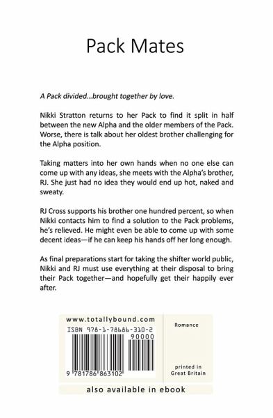 A Pack divided…brought together by love. Nikki Stratton returns to her Pack to find it split in half between the new Alpha and the older members of the Pack. Worse, there is talk about her oldest brother challenging for the Alpha position. Taking matters into her own hands when no one else can come up with any ideas, she meets with the Alpha's brother, RJ. She just had no idea they would end up hot, naked and sweaty. RJ Cross supports his brother one hundred percent, so when Nikki contacts him to find a solution to the Pack problems, he's relieved. He might even be able to come up with some decent ideas-if he can keep his hands off her long enough. As final preparations start for taking the shifter world public, Nikki and RJ must use everything at their disposal to bring their Pack together-and hopefully get their happily ever after.