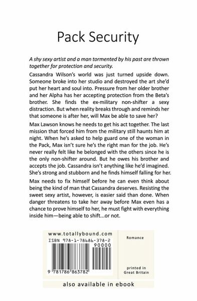 A shy sexy artist and a man tormented by his past are thrown together for protection and security. Cassandra Wilson’s world was just turned upside down. Someone broke into her studio and destroyed the art she’d put her heart and soul into. Pressure from her older brother and her Alpha has her accepting protection from the Beta’s brother. She finds the ex-military non-shifter a sexy distraction. But when reality breaks through and reminds her that someone is after her, will Max be able to save her? Max Lawson knows he needs to get his act together. The last mission that forced him from the military still haunts him at night. When he’s asked to help guard one of the woman in the Pack, Max isn’t sure he’s the right man for the job. He’s never really felt like he belonged with the others since he is the only non-shifter around. But he owes his brother and accepts the job. Cassandra isn’t anything like he’d imagined. She’s strong and stubborn and he finds himself falling for her. Max needs to fix himself before he can even think about being the kind of man that Cassandra deserves. Resisting the sweet sexy artist, however, is easier said than done. When danger threatens to take her away before Max even has a chance to prove himself to her, he must fight with everything inside him—being able to shift...or not.