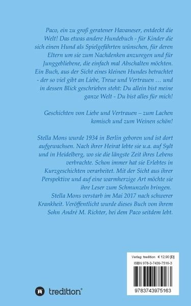 Paco, ein zu groß geratener Havaneser, entdeckt die Welt! Das etwas andere Hundebuch - für Kinder die sich einen Hund als Spielgefährten wünschen, für deren Eltern um sie zum Nachdenken anzuregen und für Junggebliebene, die einfach mal Abschalten möchten. Ein Buch, aus der Sicht eines kleinen Hundes betrachtet - der so viel gibt an Liebe, Treue und Vertrauen ... und in dessen Blick geschrieben steht: Du allein bist meine ganze Welt - Du bist alles für mich!Geschichten von Liebe und Vertrauen - zum Lachen komisch und zum Weinen schön!