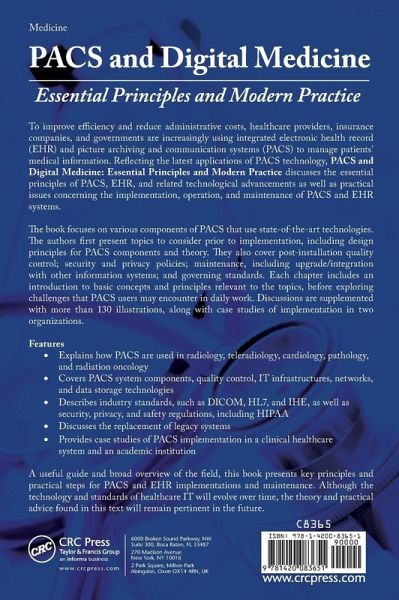 This useful guide presents key principles and practical steps for PACS and EHR implementations and maintenance. It explains how PACS are used in radiology, teleradiology, cardiology, pathology, and radiation oncology. The authors cover PACS system components, quality control, IT infrastructures, networks, and data storage technologies. They also describe industry standards; security, privacy, and safety regulations; and the replacement of legacy systems. Discussions are supplemented with more than 130 illustrations, along with case studies of implementation in two organizations.