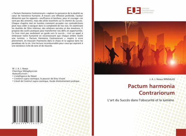 « Pactum Harmonia Contrariorum » explore la puissance de la dualité au coeur de l'existence humaine. À travers une réflexion profonde, l'auteur démontre que les opposés-souffrance et bonheur, peur et courage-ne sont pas des ennemis, mais des alliés essentiels sur le chemin du succès.Chaque chapitre met en lumière comment accepter ces contradictions peut nous aider à naviguer dans la complexité de nos vies. En examinant les dualités de l'être intérieur, des relations sociales et des émotions, il propose des outils pratiques pour transformer nos défis en opportunités.Ce livre n'est pas seulement un guide vers le succès ; c'est un appel à embrasser notre humanité en reconnaissant que chaque ombre recèle une lumière. « Pactum Harmonia Contrariorum » inspire à vivre pleinement, en trouvant l'harmonie dans le chaos et la sagesse dans les paradoxes de la vie. Une lecture incontournable pour ceux qui aspirent à une existence riche de sens et de réussite.
