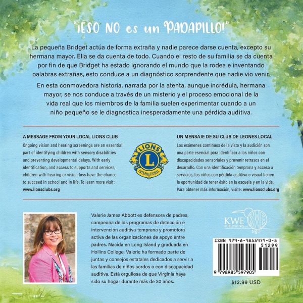 La pequeña Bridget actúa de forma extraña y nadie parece darse cuenta, excepto su hermana mayor. Ella se da cuenta de todo. Cuando el resto de su familia se da cuenta por fin de que Bridget ha estado ignorando el mundo que la rodea e inventando palabras extrañas, esto conduce a un diagnóstico sorprendente que nadie vio venir. En esta conmovedora historia, narrada por la atenta, aunque incrédula, hermana mayor, se nos conduce a través de un misterio y el proceso emocional de la vida real que los miembros de la familia suelen experimentar cuando a un niño pequeño se le diagnostica inesperadamente una pérdida auditiva. Little Bridget is acting strangely and no one seems to notice-except her older sister. She notices everything. When the rest of her family finally realize that Bridget has been ignoring the world around her and inventing weird words, it leads to a startling diagnosis no one saw coming. In this touching story, narrated by the attentive, yet incredulous, older sister, we are led through a mystery and into the real-life emotional process family members often experience when a young child is unexpectedly diagnosed with hearing loss.