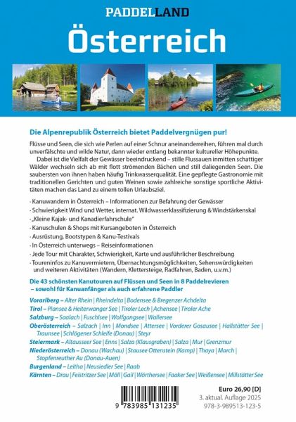 Die Alpenrepublik Österreich bietet Paddelvergnügen pur!Flüsse und Seen, die sich wie Perlen auf der Schnur aneinanderreihen, führen mal durch eine unverfälschte und wilde Natur, dann wieder entlang bekannter kultureller Höhepunkte.Dabei ist die Vielfalt der Gewässer beeindruckend - stille Flussauen inmitten schattiger Wälder wechseln sich ab mit flott strömenden Bächen und still daliegenden Seen. Die saubersten von ihnen haben häufig Trinkwasserqualität.Eine gepflegte Gastronomie mit traditionellen Gerichten und guten Weinen sowie zahlreiche sonstige sportliche Aktivitäten machen das Land zu einem tollen Urlaubsziel.