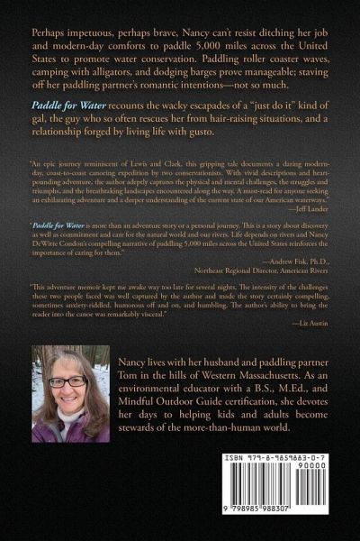 Perhaps impetuous, perhaps brave, Nancy can't resist ditching her job and modern-day comforts to paddle 5,000 miles across the United States to promote water conservation. Paddling roller coaster waves, camping with alligators, and dodging barges prove manageable; staving off her paddling partner's romantic intentions-not so much. Paddle for Water recounts the wacky escapades of a "just do it" kind of gal, the guy who so often rescues her from hair-raising situations, and a relationship forged by living life with gusto. Paddle For Water is a travel memoir of my adventures as I test my mettle crossing the United States by canoe, voicing a message of water conservation. My companion, a skillful canoeist and outdoorsman, is a man with whom I insist on platonic relations. After paddling 5,000 miles from the Pacific to the Atlantic Ocean and many harrowing adventures, he ultimately wins my heart. Playing cat and mouse in our tiny canoe with ocean-going freighters and riding 4-foot waves on the Columbia River, the stage is set for adventure. The Snake River tries our patience with wind, storms, heat, and rapids. Our canoe breaks away, smashes into rocks, and requires major repair. After an overwintering hiatus in the Tetons when our travel corridors are frozen, we finally resume our expedition on the Yellowstone River, this time with a puppy. Sirius rides atop the gear like a riverboat queen as we zig-zag down the Yellowstone River with the snowmelt. This beautiful waterway enters the "Miserable Missouri" with its industry and commerce. Relentless wind makes for hair-raising paddling daily while nightly thunderstorms beat us into submission. Continual exertion and frazzled nerves become unbearable. After nine months of paddling and emotional exhaustion, we must leave river life, destination unrealized. The "strictly friends" paradigm fell flat as the physical and emotional trials throughout the expedition made me realize I cannot - and don't want to - live without Tom. We marry and get absorbed into mainstream society. After eleven years of civilization, the river's beckoning becomes irresistible. The itch of unfinished business finally motivates us to leave our house, jobs, and belongings behind and become river people again. We return to the same boat ramp we departed from on the Missouri River in Atchison, Kansas. There we join spring runoff, this time as a married couple, to complete our goal. Avoiding the turbulence of what we dub the Missouri River Monster, we pour into the Mississippi River. Unlike Huck Finn, we turn off at Cairo, Illinois, onto the Ohio, where we begin an uphill climb to the Appalachian Mountains. On the Tennessee River, we sweat through a tornado watch but eventually reach the Little Tennessee where, wading waist-deep, we yank and drag and pole our canoe up the rapids until we have no more fight left. Portage by car is our only option. Once over the mountains, we descend the Savannah River where we unwittingly share campsites with alligators. Thirteen months of river life later, we paddle into the Atlantic Ocean. We ride the waves onto Tybee Island beach to a throng of cheering reporters and family. Together we toast the completion of our quest with cups of pure, clean water.