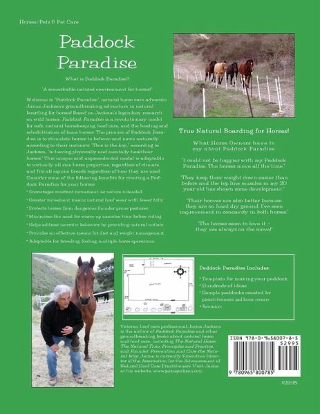 What is Paddock Paradise? "A remarkable natural environment for horses!" Welcome to "Paddock Paradise", natural horse care advocate Jaime Jackson’s groundbreaking adventure in natural boarding for horses! Based on Jackson’s legendary research on wild horses, Paddock Paradise is a revolutionary model for safe, natural horsekeeping, hoof care, and the healing and rehabilitation of lame horses. The premise of Paddock Paradise is to stimulate horses to behave and move naturally according to their instincts. "This is the key," according to Jackson, "to having physically and mentally healthier horses." This unique and unprecedented model is adaptable to virtually all size horse properties, regardless of climate, and fits all equine breeds regardless of how they are used. Consider some of the following benefits for creating a Paddock Paradise for your horses: • Encourages constant movement, as nature intended. • Greater movement means natural hoof wear with fewer bills. • Protects horses from dangerous founder-prone pastures. • Minimizes the need for warm-up exercise time before riding. • Helps address neurotic behavior by providing natural outlets. • Provides an effective means for diet and weight management. • Adaptable for breeding, foaling, multiple horse operations. Paddock Paradise Includes: • Template for making your paddock • Hundreds of ideas • Sample paddocks created by practitioners and horse owners • Resources True Natural Boarding for Horses! What Horse Owners have to say about Paddock Paradise: "I could not be happier with my Paddock Paradise. The horses move all the time." "They keep their weight down easier than before and the top line muscles in my 20 year old has shown some development." "Their hooves are also better because they are on hard dry ground. I've seen improvement in concavity in both horses." "The horses seem to love it – they are always on the move!"