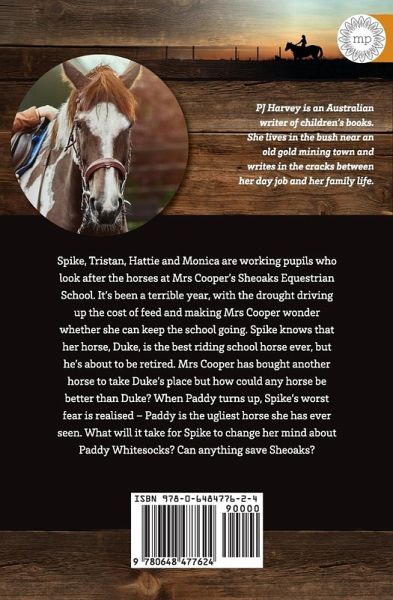 Spike, Tristan, Hattie and Monica are working pupils who look after the horses at Mrs Cooper's Sheoaks Equestrian School. It's been a terrible year, with the drought driving up the cost of feed and making Mrs Cooper wonder whether she can keep the school going. Spike knows that her horse, Duke, is the best riding school horse ever, but he's about to be retired. Mrs Cooper has bought another horse to take Duke's place but how could any horse be better than Duke? When Paddy turns up, Spike's worst fear is realised - Paddy is the ugliest horse she has ever seen. What will it take for Spike to change her mind about Paddy Whitesocks? Can anything save Sheoaks?