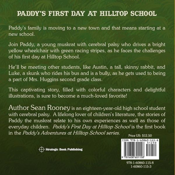 Paddy's family is moving to a new town and that means starting at a new school. Join Paddy, a young muskrat with cerebral palsy who drives a bright yellow wheelchair with green racing stripes, as he faces the challenges of his first day at Hilltop School. He'll be meeting other students, like Austin, a tall, skinny rabbit, and Luke, a skunk who rides his bus and is a bully, as he gets used to being a part of Mrs. Huggins second grade class. This captivating story, filled with colorful characters and delightful illustrations, is sure to become a much-loved favorite! Author Sean Rooney is an eighteen-year-old high school student with cerebral palsy. A lifelong lover of children's literature, the stories of Paddy the muskrat relate to his own experiences as well as those of everyday children. Paddy's First Day of School is the first book in the Paddy's Adventures at Hilltop School series.