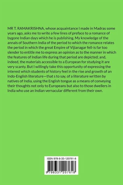 MR T. RAMAKRISHNA, whose acquaintance I made in Madras some years ago, asks me to write a few lines of preface to a romance of bygone Indian days which he is publishing. My knowledge of the annals of Southern India of the period to which the romance relates the period in which the great Empire of Vijianagar fell-is far too slender to entitle me to express an opinion as to the manner in which the features of Indian life during that period are depicted; and, indeed, the materials accessible to a European for studying it are very scanty. But I willingly take this opportunity of expressing the interest which students of history feel in the rise and growth of an Indo-English literature-that s to say, of a literature written by natives of India, using the English tongue as a means of conveying their thoughts not only to Europeans but also to those dwellers in India who use an Indian vernacular different from their own.