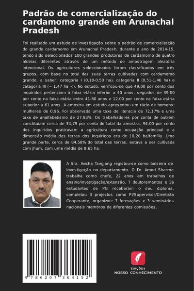 Foi realizado um estudo de investigação sobre o padrão de comercialização do grande cardamomo em Arunachal Pradesh, durante o ano de 2014-15, tendo sido seleccionados 100 grandes produtores de cardamomo de quatro aldeias diferentes através de um método de amostragem aleatória intencional. Os agricultores seleccionados foram classificados em três grupos, com base no total das suas terras cultivadas com cardamomo grande, a saber: categoria I (0,10-0,50 ha), categoria II (0,51-1,46 ha) e categoria III (= 1,47 ha <). No estudo, verificou-se que 49,00 por cento dos inquiridos pertenciam à faixa etária inferior a 40 anos, seguidos de 39,00 por cento na faixa etária entre 41-60 anos e 12,00 por cento na faixa etária superior a 61 anos. A amostra em estudo apresentou um rácio de homens: mulheres de 0,96. Foi observada uma taxa de literacia de 72,17% e uma taxa de analfabetismo de 27,83%. Os trabalhadores por conta de outrem constituíam cerca de 34,79 por cento do total da amostra. 94,00 por cento dos inquiridos praticavam a agricultura como ocupação principal e a dimensão média das terras dos inquiridos era de 10,20 ha/família. Uma grande parte, cerca de 84,58% do total das terras, estava a ser cultivada com jhum, com uma média de 8,65 ha.