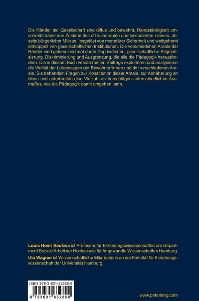 Die Ränder der Gesellschaft sind diffus und bewohnt. Randständigkeit umschreibt dabei den Zustand des oft vulnerablen und exkludierten Lebens, abseits bürgerlicher Milieus, losgelöst von monetärer Sicherheit und weitgehend entkoppelt von gesellschaftlichen Institutionen. Die verschiedenen Areale der Ränder sind gekennzeichnet durch Deprivationen, gesellschaftliche Stigmatisierung, Diskriminierung und Ausgrenzung, die alle die Pädagogik herausfordern. Die in diesem Buch versammelten Beiträge explorieren und analysieren die Vielfalt der Lebenslagen der Bewohner_innen und der verschiedenen Areale. Sie behandeln Fragen zur Konstitution dieser Areale, zur Annäherung an diese und unterbreiten eine Vielzahl an Vorschlägen unterschiedlichen Ausmaßes, wie die Pädagogik damit umgehen kann.