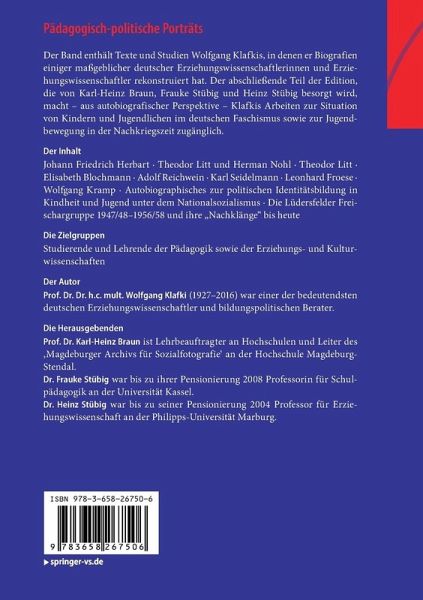 Johann Friedrich Herbart.- Theodor Litt und Herman Nohl.- Theodor Litt.- Elisabeth Blochmann.- Adolf Reichwein.- Karl Seidelmann.- Leonhard Froese.- Wolfgang Kramp.- Autobiographisches zur politischen Identitätsbildung in Kindheit und Jugend unter dem Nationalsozialismus.- Die Lüdersfelder Freischargruppe 1947/48-1956/58 und ihre "Nachklänge" bis heute.