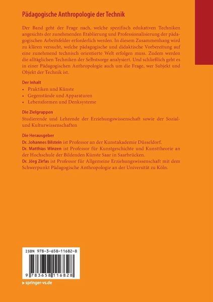 Der Band geht der Frage nach, welche spezifisch edukativen Techniken angesichts der zunehmenden Etablierung und Professionalisierung der pädagogischen Arbeitsfelder erforderlich werden. In diesem Zusammenhang wird zu klären versucht, welche pädagogische und didaktische Vorbereitung auf eine zunehmend technisch orientierte Welt erfolgen muss. Zudem werden die alltäglichen Techniken der Selbstsorge analysiert. Und schließlich geht es in einer Pädagogischen Anthropologie auch um die Frage, wer Subjekt und Objekt der Technik ist.