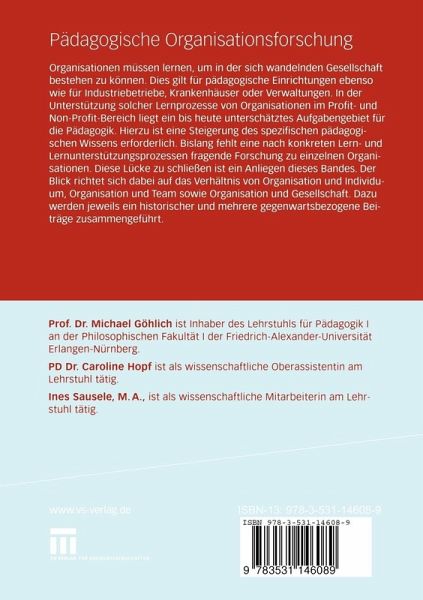 Theorie und Methoden.- Pädagogische Organisationsforschung. Eine Einführung.- Grundlagen einer pädagogischen Theorie des Organisationslernens.- Vom Archiv zum Prozess. Historische Spuren organisationalen Lernens am Beispiel der Versuchsschule Mannheim-Feudenheim.- Innen I: Organisation und Individuum aus pädagogischer Sicht.- Charisma, grammar of schooling und Steuerungsprobleme des Bildungssystems. Pestalozzi und sein Institut in Yverdon.- "Pädagogische Organisation" aus institutionstheoretischer Perspektive. Zur Ausdifferenzierung von Institutionalformen lebenslangen Lernens in der Transformationsgesellschaft.- Personalentwicklung als pädagogisches Handeln. Erste Hinweise aus einer empirischen Studie.- "Preparing Women to lead". Ergebnisse von Mentoring-Programmen.- Innen II: Organisation und Team aus pädagogischer Sicht.- Pädagogische Konferenzen und kollegiale Schulentwicklung. Zur Rolle des Kollegiums in der Odenwaldschule.- Schulprogramm als kollegialer Diskurs. Überlegungen vor dem Hintergrund von Evaluation.- Organisationsanalyse und Teamentwicklung. Organisationsprojekte in der Industrie.- Zum Verhältnis von Lern- und Arbeitsorganisation. Ergebnisse der Weiterbildungsforschung.- Außen: Organisation und Gesellschaft aus pädagogischer Sicht.- Programmentwicklung als Spiegel gesellschaftlichen Wandels? Die VHS Dresden von 1945 bis 1997.- Kirche, Markt und Bildung. Change Management in Einrichtungen der Evangelischen Erwachsenenbildung.- Pädagogik in Organisationen. Potenziale eines ökonomischen Programms der Bildungsreform.- Pädagogische Netzwerkarbeit und interorganisationales Kompetenzmanagement. Anmerkungen zur innovativen Praxis am Beispiel Lernender Regionen und Metropolen.- Autorenverzeichnis.