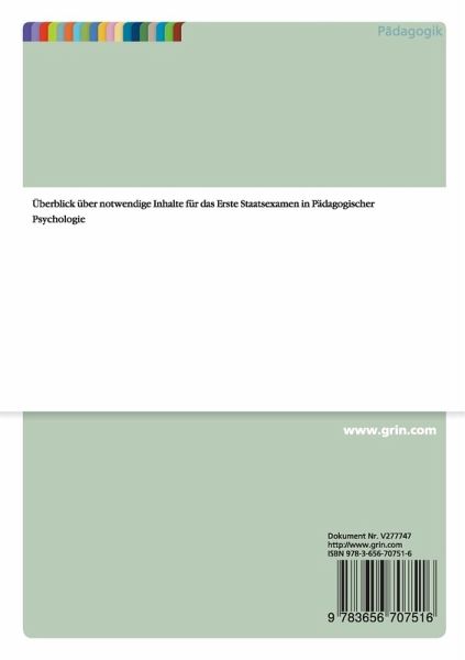 Prüfungsvorbereitung aus dem Jahr 2010 im Fachbereich Pädagogik - Pädagogische Psychologie, Bayerische Julius-Maximilians-Universität Würzburg, Sprache: Deutsch, Abstract: Überblick über notwendige Inhalte für das Erste Staatsexamen in Pädagogischer Psychologie