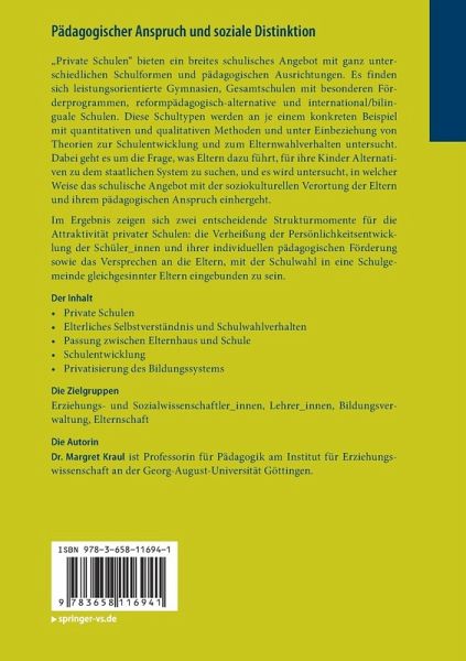 "Private Schulen" bieten ein breites schulisches Angebot mit ganz unterschiedlichen Schulformen und pädagogischen Ausrichtungen. Es finden sich leistungsorientierte Gymnasien, Gesamtschulen mit besonderen Förderprogrammen, reformpädagogisch-alternative und international/bilinguale Schulen. Diese Schultypen werden an je einem konkreten Beispiel mit quantitativen und qualitativen Methoden und unter Einbeziehung von Theorien zur Schulentwicklung und zum Elternwahlverhalten untersucht. Dabei geht es um die Frage, was Eltern dazu führt, für ihre Kinder Alternativen zu dem staatlichen System zu suchen, und es wird untersucht, in welcher Weise das schulische Angebot mit der soziokulturellen Verortung der Eltern und ihrem pädagogischen Anspruch einhergeht.