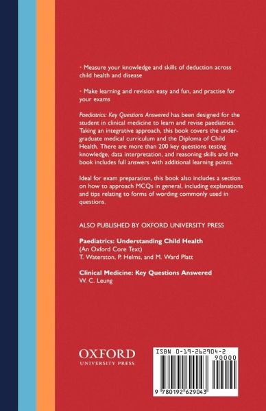 In our new Key Questions Answered series, Paediatrics KQA has been to help the clinical medicine student learn and revise their paediatrics. Designed to be used on its own for revision and additional learning, this book can also be used to complement the Paediatrics: Understanding Child Health (An Oxford Core Text). Taking an integrative approach, this book covers the undergraduate medical curriculum and the Diploma of Child Health, giving a broad base of questions both knowledge based and data-interpretive and reasoning, and has full answers which contain additional learning points. There are more than 200 key questions testing both knowledge, data interpretation and reasoning skills. It also includes a section on how to approach MCQs: For example; commonly this means something is often encountered or its association is not a surprise. Rarely here the association is well-recognised but uncommon.