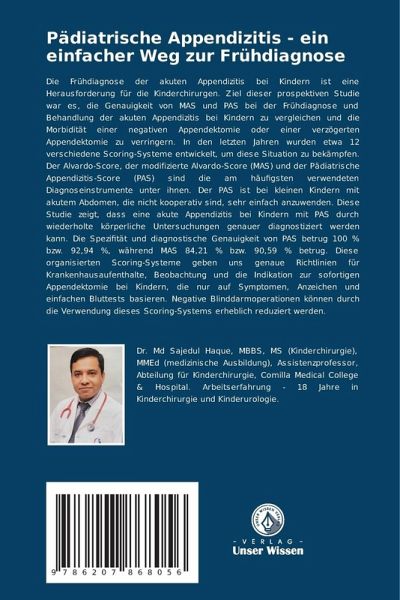 Die Frühdiagnose der akuten Appendizitis bei Kindern ist eine Herausforderung für die Kinderchirurgen. Ziel dieser prospektiven Studie war es, die Genauigkeit von MAS und PAS bei der Frühdiagnose und Behandlung der akuten Appendizitis bei Kindern zu vergleichen und die Morbidität einer negativen Appendektomie oder einer verzögerten Appendektomie zu verringern. In den letzten Jahren wurden etwa 12 verschiedene Scoring-Systeme entwickelt, um diese Situation zu bekämpfen. Der Alvardo-Score, der modifizierte Alvardo-Score (MAS) und der Pädiatrische Appendizitis-Score (PAS) sind die am häufigsten verwendeten Diagnoseinstrumente unter ihnen. Der PAS ist bei kleinen Kindern mit akutem Abdomen, die nicht kooperativ sind, sehr einfach anzuwenden. Diese Studie zeigt, dass eine akute Appendizitis bei Kindern mit PAS durch wiederholte körperliche Untersuchungen genauer diagnostiziert werden kann. Die Spezifität und diagnostische Genauigkeit von PAS betrug 100 % bzw. 92,94 %, während MAS 84,21 % bzw. 90,59 % betrug. Diese organisierten Scoring-Systeme geben uns genaue Richtlinien für Krankenhausaufenthalte, Beobachtung und die Indikation zur sofortigen Appendektomie bei Kindern, die nur auf Symptomen, Anzeichen und einfachen Bluttests basieren. Negative Blinddarmoperationen können durch die Verwendung dieses Scoring-Systems erheblich reduziert werden.
