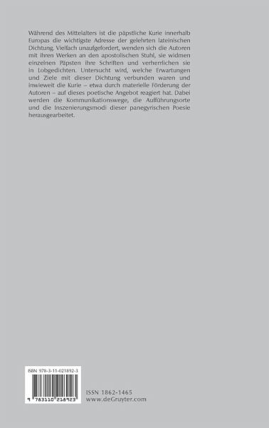 During the Middle Ages, the Papal Curia was the most important addressee for learned Latin poetry within Europe. Much of it was unsolicited; authors address their works to the Apostolic See, they dedicate their writings to individual popes and glorify them in panegyrics. The study examines the expectations and aims associated with such poetry and to what extent the Curia responded to these poetic offerings â?? perhaps with material sponsorship for the authors. For this, it develops the paths of communication, the places of performance and modes of presenting this panegyric poetry.