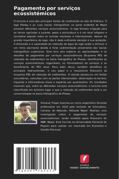 O turismo é uma das principais fontes de rendimento no vale de Pokhara. O lago Phewa e as suas bacias hidrográficas na parte ocidental do Nepal prestam diferentes serviços ecossistémicos. O lago fornece irrigação para as terras agrícolas a jusante, apoia a piscicultura e é um local religioso e recreativo popular entre os turistas nacionais e internacionais. Apesar da grande importância do lago, não é dada suficiente atenção à sua proteção. A dimensão e a capacidade de retenção de água do lago estão a diminuir a um ritmo alarmante devido à forte sedimentação proveniente das bacias hidrográficas superiores. Este livro visa explorar as oportunidades e os desafios do pagamento por serviços ecossistémicos (Esquema PES de retenção de sedimentos) na bacia hidrográfica de Phewa, identificando os serviços ecossistémicos negociáveis, os fornecedores de serviços e os beneficiários do PES atual. Para além disso, também identificou os principais intervenientes, o seu papel e o mecanismo financeiro do esquema PES de retenção de sedimentos. O estudo baseou-se em fontes secundárias, consultas com as partes interessadas, observação no terreno, inquérito a informadores-chave e inquérito por questionário. Os resultados mostram que, entre os diferentes serviços ecossistémicos, o turismo está classificado em primeiro lugar e que a retenção de sedimentos está a ser comercializada na bacia hidrográfica de Phewa.