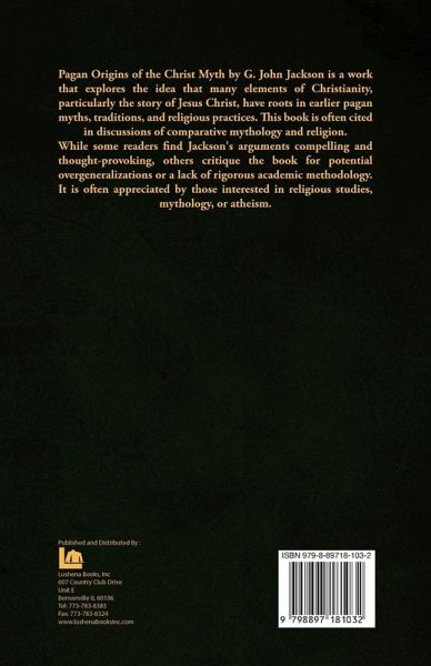 Pagan Origins of the Christ Myth by G. John Jackson is a work that explores the idea that many elements of Christianity, particularly the story of Jesus Christ, have roots in earlier pagan myths, traditions, and religious practices. This book is often cited in discussions of comparative mythology and religion. While some readers find Jackson's arguments compelling and thought-provoking, others critique the book for potential overgeneralizations or a lack of rigorous academic methodology. It is often appreciated by those interested in religious studies, mythology, or atheism.