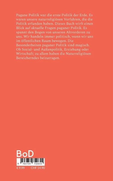 Pagane Politik war die erste Politik der Erde. Es waren unsere naturreligiösen Vorfahren, die die Politik erfunden haben. Dieses Buch wirft einen Blick auf aktuelle Fragen paganer Politik. Es spannt den Bogen von unseren Altvorderen zu uns. Wir handeln immer politisch, wenn wir uns im öffentlichen Raum bewegen. Die Besonderheiten paganer Politik sind magisch. Ob Sozial- und Außenpolitik, Erziehung oder Wirtschaft; zu allem haben die Naturreligiösen Bereicherndes beizutragen.