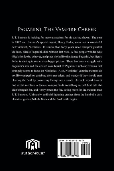 P. T. Barnum is looking for more attractions for his touring shows. The year is 1882 and Barnum's special agent, Henry Feder, seeks out a wonderful new violinist, Nicolaties. It is more than forty years since Europe's greatest violinist, Nicolo Paganini, died without last rites. A few people wonder why Nicolaties looks, behaves, and plays violin like that famed Paganini, but Henry Feder is starting to see an even bigger picture. There has been a struggle with Paganini's son and the church over burial of Paganini's unblest remains that strangely seems to focus on Nicolaties. Also, Nicolaties' vampire mentors do not like competition grabbing their star talent, and wonder if they should start clearing the field by converting Henry into a snack. As luck would have it one of the mentors, a female vampire finds something in that first bite she didn't bargain for, and Henry enters the fray acting more for the mentors than P. T. Barnum. Ultimately, artificial lightning crashes from the hand of a dark electrical genius, Nikola Tesla and the final battle begins.