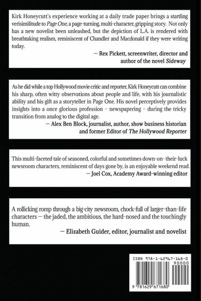 Page One is a seriocomic tale about journalists engaged in a newspaper war long before the current 24/7 news cycle but not before a willingness to forego personal integrity was creeping into "the media," and the line between genuine importance and celebrityhood was starting to blur.The Los Angeles Morning News, known to everyone in its newsroom as The Morning Snooze, is locked in a losing battle with the city's leading newspaper. The employees have a motto: "If it's news in L.A., it's news to us."Then new blood enters the newsroom. It isn't long before the newcomers discover The Morning News' dirty little secret: it is not the distinguished paper of record. So it can attack news the way it wants to with splashy celebrity coverage, sticking up for the little guy and perhaps uncovering a serial killer hiding in plain sight.
