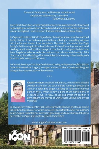 Every family has a story. And for Angela Fortnum, her maternal family story would begin eight generations before her and reach back to the turn of the eighteenth century in England - and it is a story that she will tell and continue today. In Pages and Leaflets of North Oxfordshire, author Angela Fortnum shares a well-researched family history of her maternal grandfathers, offering a compelling window into the life and times of her ancestors. This history chronicles the Page family's shift from agricultural and labourer life to self-employment and small holding, and it also lists the changes in the family's religious beliefs over time. Angela includes as well a discussion of the richness and diversity of the church and chapel buildings that were linked in some way to her family, each of which tells a story of their own. In the end, the story of the Page family lives on today, as Pages and Leaflets of North Oxfordshire stands as a legacy to Angela and her mother's family and the great changes they experienced over the centuries. www.angelafortnumbooks.com