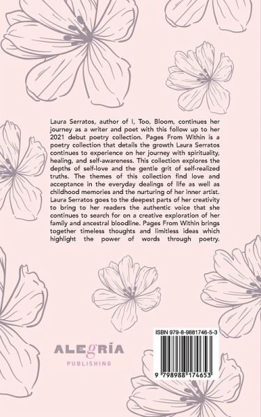 Laura Serratos, author of I, Too, Bloom, continues her journey as a writer and poet withthis follow up to her 2021 debut poetry collection. Pages From Within is a poetrycollection that explores the depths of self-love and the gentle grit of self-realized truths.Pages From Within brings together timeless thoughts and limitless ideas which highlightthe power of words through poetry.