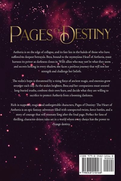 Aetheria is on the edge of collapse, and its fate lies in the hands of those who have suffered its deepest betrayals. Brea, bound to the mysterious Heart of Aetheria, must harness its power as darkness closes in. With allies who may not be what they seem and secrets lurking in every shadow, she faces a perilous journey that will test her strength and challenge her beliefs. The realm's hope is threatened by a rising force of ancient magic, and enemies grow stronger each day. As the stakes heighten, Brea and her companions must unravel long-buried truths, confront their own fears, and decide what they are willing to sacrifice to protect Aetheria from a looming darkness. Rich in suspense, magic, and unforgettable characters, Pages of Destiny: The Heart of Aetheria is an epic fantasy adventure filled with unexpected twists, fierce battles, and a story of courage that will resonate long after the final page. Perfect for fans of thrilling, character-driven tales set in a world where every choice has the power to change destiny.