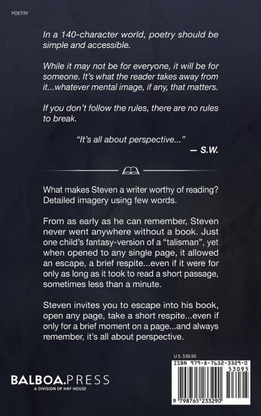 In a 140-character world, poetry should be simple and accessible. While it may not be for everyone, it will be for someone. It's what the reader takes away from it...whatever mental image, if any, that matters. If you don't follow the rules, there are no rules to break. "It's all about perspective..." - S.W.