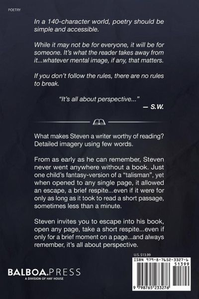 In a 140-character world, poetry should be simple and accessible. While it may not be for everyone, it will be for someone. It's what the reader takes away from it...whatever mental image, if any, that matters. If you don't follow the rules, there are no rules to break. "It's all about perspective..." - S.W.